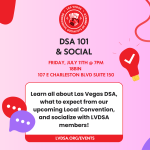 Learn all about Las Vegas DSA, what to expect from our upcoming Local Convention, and socialize with LVDSA members! The 101 will start at 7pm, and the social at 7:30pm.