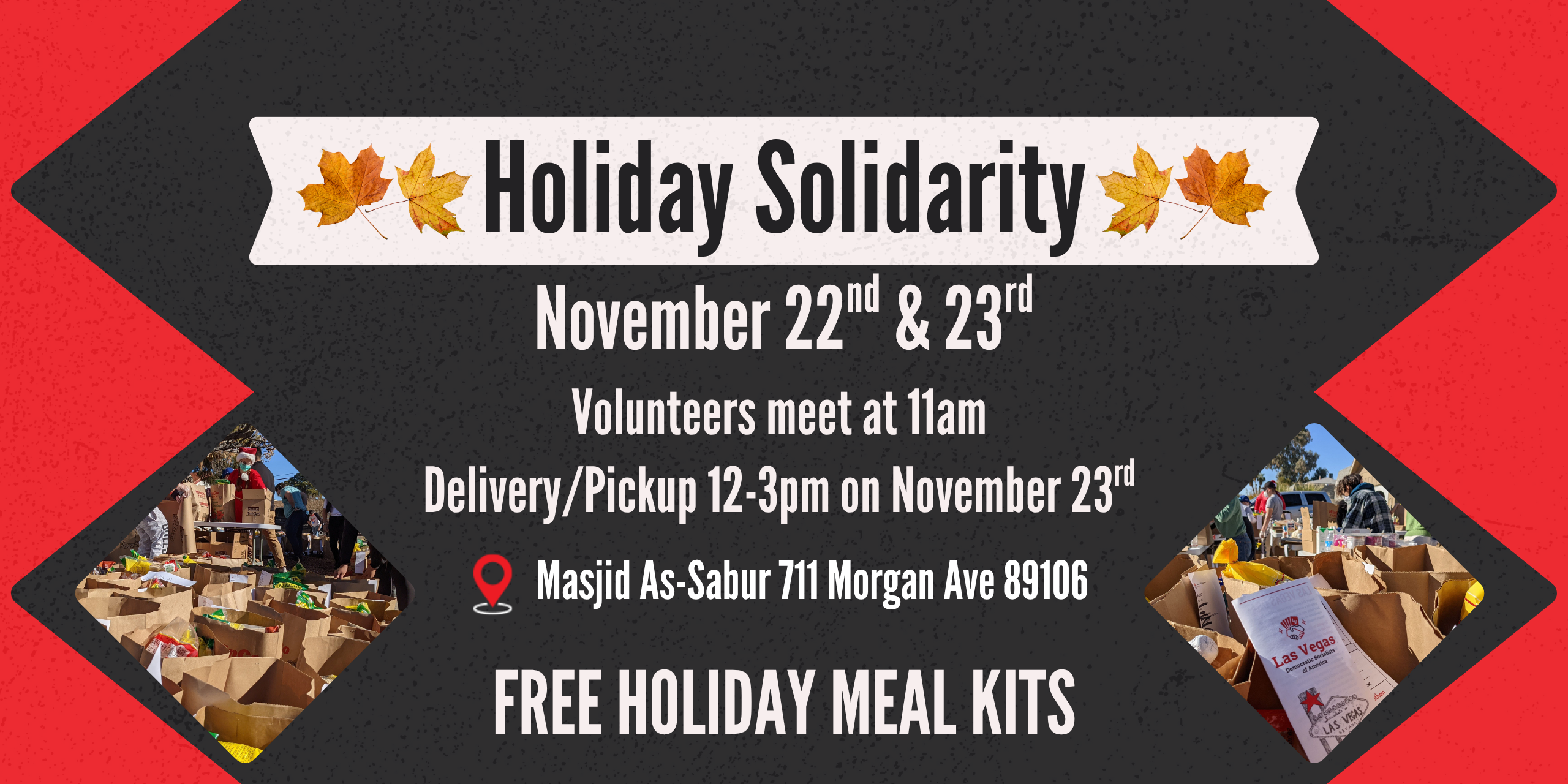 Meal kits can be requested for delivery. You can also pick up in-person from 12 pm to 3 PM on Sunday, November 23rd at Masjid As-Subur, located at 711 Morgan Ave, Las Vegas, NV 89106.
